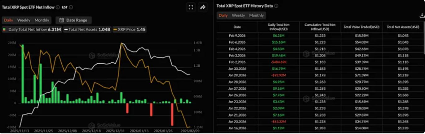 统计数据显示,美国股票市场的现货XRP ETF目前合计持有超过10.4亿美元规模的总净资产测算。XRP ETF已交易 56 天,并且仅出现过4天的资金净流出规模。
