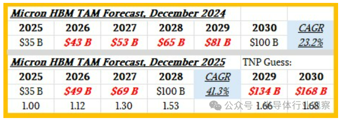 这些针对HBM的潜在市场规模(TAM)数据是基于自然年计算的。在2024年12月的预测中,美光科技预计HBM市场在2025年的收入将达到350亿美元,并在2030年增长到约1000亿美元,复合年增长率(CAGR)为23.2%。然而,美光科技现在将市场规模达到1000亿美元的预期时间从2030年下调至2028年,这意味着与今年预计的350亿美元HBM销售额相比,复合年增长率将超过40%。