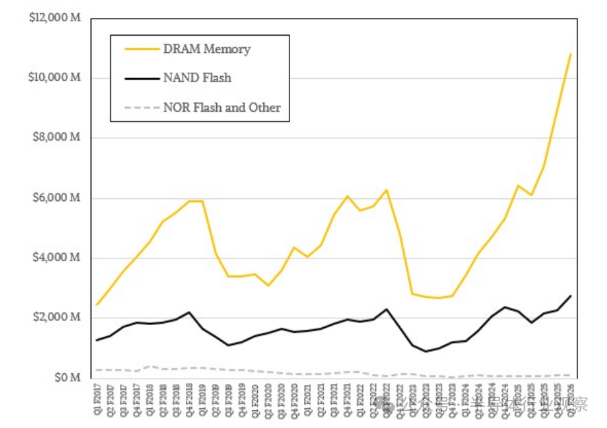 在 11 月季度,美光科技售出了价值 108.1 亿美元的各种 DRAM 内存,同比增长 68.9%。2026 财年第一季度,NAND 闪存芯片、驱动器和卡的收入为 27.4 亿美元,增长了 22.4%;而 NOR 闪存和其他产品仅带来了 8800 万美元的销售额。