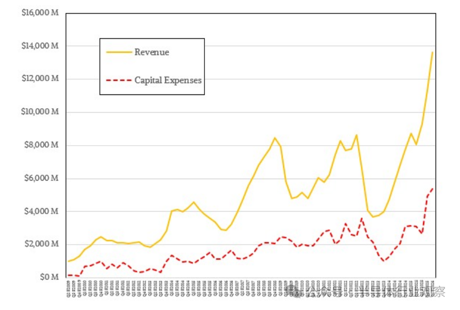 美光科技在2026财年第一季度资本支出为54亿美元,略高于其预计2026财年200亿美元总支出的比例。这比去年同期增长了1.7倍。美光科技在该季度末拥有103.2亿美元的现金储备,这为其扩建晶圆厂和工厂提供了一定的回旋余地。