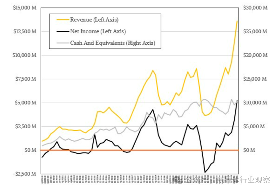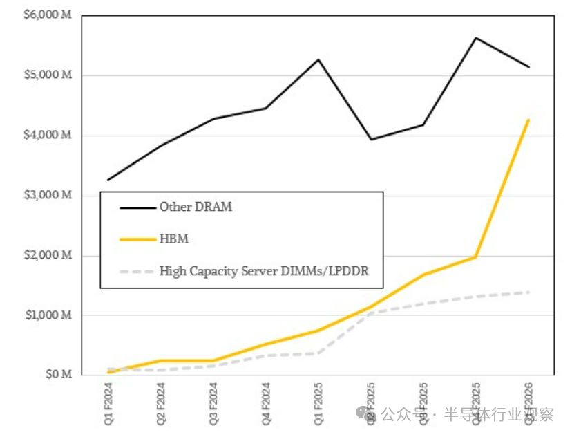 根据美光过去几个季度发布的少量声明推测,是高容量服务器 DIMM 和 LPDDR5 内存贡献了约 14 亿美元的营收,同比增长 3.7 倍;而 HBM 内存贡献了约 42.7 亿美元的营收,同比增长 5.7 倍。这增长速度令人惊叹。