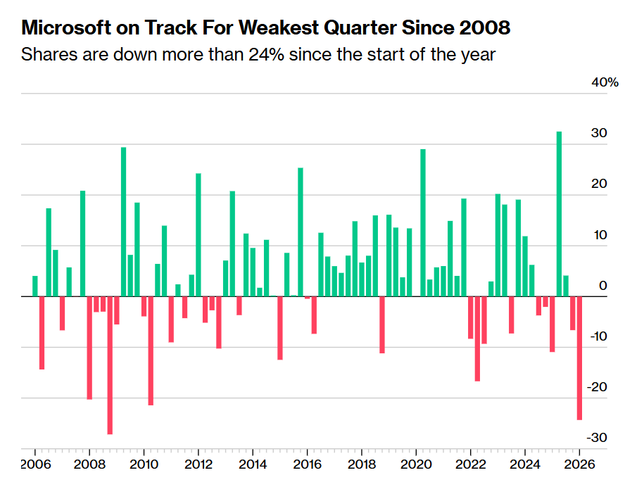 因此在一些华尔街分析师看来,微软这轮下跌并不只是普通估值回调,而是市场第一次系统性地质疑:AI到底会放大微软,还是先削弱微软长期以来最为关键的软件商业模式。微软股价正迈向自2008年四季度以来最差季度表现,意味着对于华尔街来说,微软正从“AI浪潮之下的最先受益者”被重新定价为“AI资本最密集、但投资回报验证仍不足的超级科技巨头”。