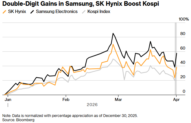 三星和SK海力士股价实现双位数上涨,提振Kospi指数