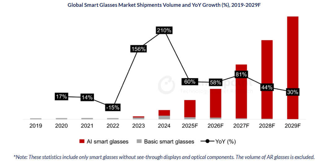 智能眼镜的成功发布,一波史无前例的AI智能眼镜涌现出来,从供应链公司提供的参考设计产品到眼镜品牌厂商推出的商业化产品,均已在2024年底之后问世。该机构预计,随着2025年智能手机领军企业们陆续推出首款AI智能眼镜,且更多智能消费电子设备公司可能将在2025年和2026年陆续进入市场,Counterpoint预计2025年全球智能眼镜市场将实现60%的同比增长,并在2025年至2029年期间维持超过60%的年均复合增长率。