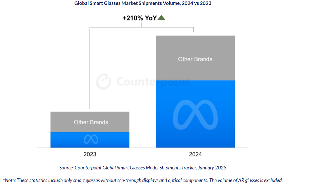 根据市场研究机构Counterpoint Research 的《全球智能眼镜型号出货量追踪报告》,2024年全球智能眼镜出货量同比增长 210%