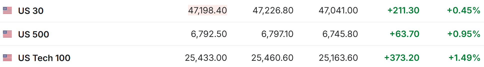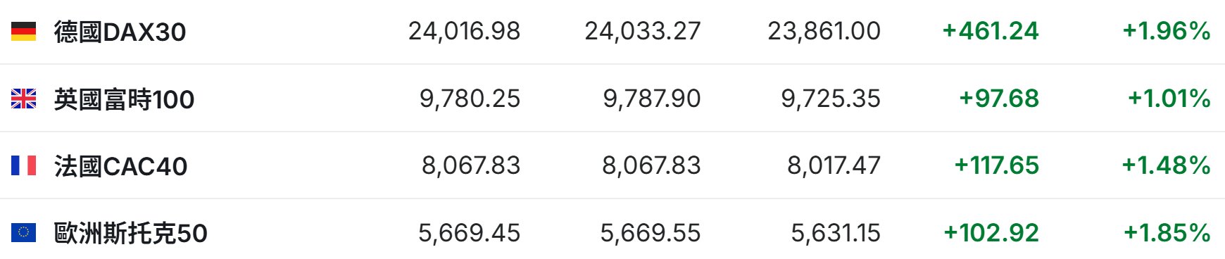 2. 截至发稿,德国DAX指数涨1.96%,英国富时100指数涨1.01%,法国CAC40指数涨1.48%,欧洲斯托克50指数涨1.85%。