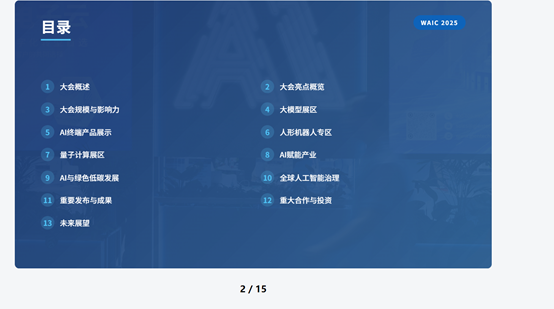 首先,《科创板日报》记者进入Z.ai,让GLM-4.5生成一份2025年世界人工智能大会(WAIC)简报,十几分钟过后,GLM-4.5生成了一份15页包含12项内容的简报,内容翔实丰富,包括大会概述、大模型展区、人形机器人展区、重要发布与成果、未来展望等。