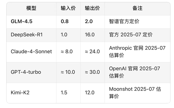 在已公布的 “原生智能体” 或Agent专用模型中,GLM-4.5目前价格最低,且开源可商用 。