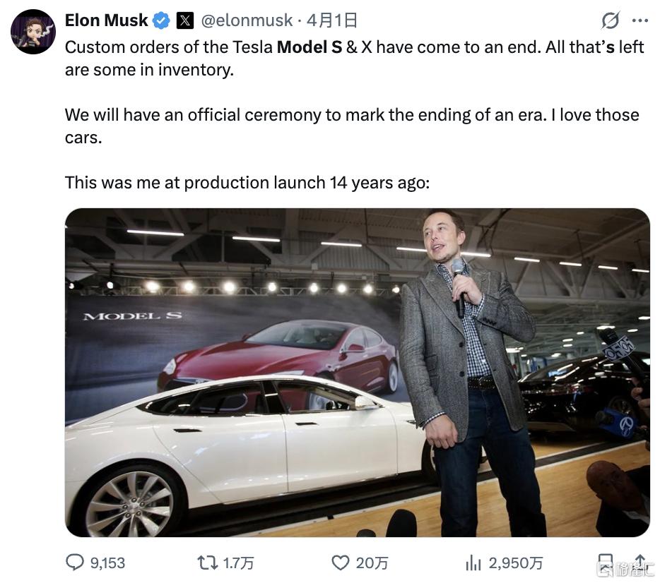 4月1日,马斯克在X平台上发文,宣布特斯拉正式停产Model S和Model X两款车型,目前已停止接受新车定制订单。