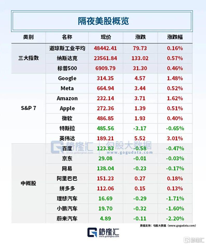 大型科技股多数上涨,英伟达涨3.01%,亚马逊涨1.62%,谷歌涨1.48%,苹果、Meta、微软微涨不足1%,特斯拉跌0.65%。
