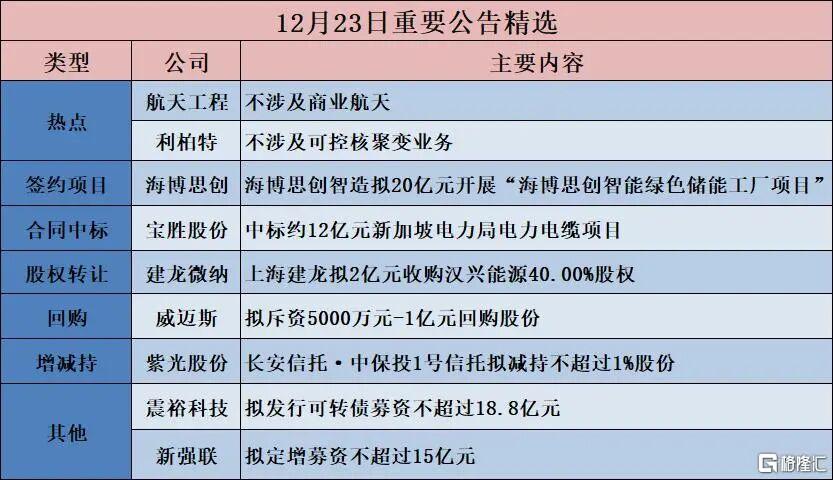 两市融资余额:截截至 12 月 22 日,上交所融资余额报12634.37 亿元,较前一交易日增加 58.21 亿元;深交所融资余额报12284.76 亿元,较前一交易日增加 67.13 亿元;两市合计24919.13 亿元,较前一交易日增加 125.34 亿元。