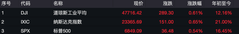 截至收盘,道琼斯工业指数涨0.61%,报47716.42点;标普500指数涨0.54%,报6849.09点;纳斯达克综合指数涨0.65%,报23365.69点。本周,道琼斯工业指数涨3.18%,标普500指数涨3.73%,纳斯达克综合指数涨4.91%。11月,道琼斯工业指数涨0.32%,标普500指数涨0.13%,纳斯达克综合指数跌1.51%。