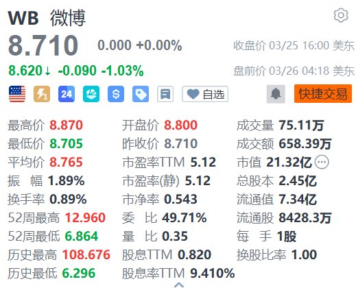 微博(WB.US)盘前跌1.03%,报8.62美元。消息面上,