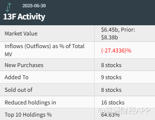 LP在第二季度的投资组合中新增了8只标的,增持9只标的,减持16只标的,清仓8只标的;其中前十大持仓标的占总市值的64.63%。