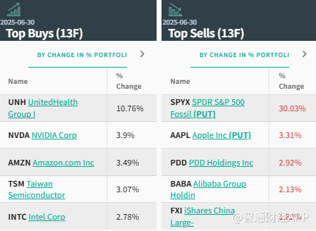 从持仓比例变化来看,前五大买入标的分别是:联合健康、英伟达、亚马逊、台积电(TSM.US)、英特尔。