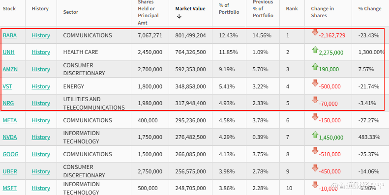 Platforms(META.US)、英伟达(NVDA.US)、谷歌-C(GOOG.US)、优步(UBER.US)和微软(MSFT.US)也跻身前十大重仓股之列。