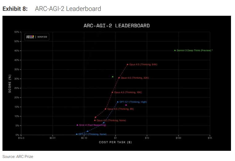更重要的是,在最具挑战性的通用智能测试ARC-AGI-2中,最新的前沿大模型Gemini 3 Deep Think得分已达到约45%,而几个月前该类模型得分仅为10-20%。考虑到人类平均得分为60%,且2026年前沿模型训练将使用约10倍计算资源,业界预期AI能力可能在多项复杂推理测试中超越人类水平。