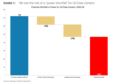 基于最新的芯片销售数据,大摩再次上调了电力需求预测,这预示着一场更为严峻的能源紧缩。报告显示,到2028年,美国面临的电力缺口已从之前的44吉瓦(GW)修正为47吉瓦。这种供需失衡表明,单纯依赖现有电网已不现实。