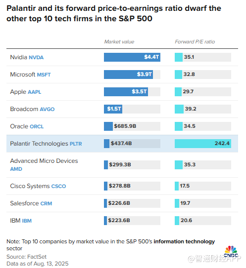 DA Davidson分析师Gil Luria最近表示,Palantir已成为标普500指数中估值最高的成分股,该公司需连续五年保持50%的年增长率,才能使估值倍数接近微软和AMD的水准。