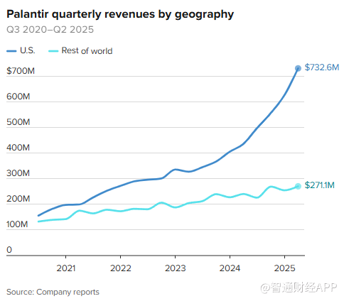 美国一直是Palantir增长的主要推动力,尤其是在该公司与美国军方签订了更多合同之后。