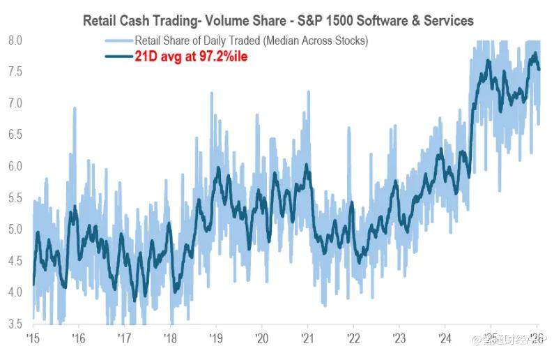 在华尔街因人工智能(AI)冲击忧虑而大举抛售软件股之际,散户投资者却选择逆势加仓,推动零售交易活跃度逼近历史高位。