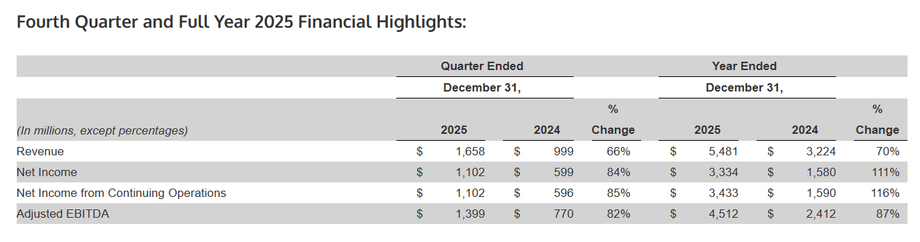 2025财年年度业绩方面,Applovin总营收约54.81亿美元,较2024财年实现大幅增长70%,净利润约33.34亿美元,大幅增长111%,该公司调整后EBITDA约为45.12亿美元,实现大幅增长87%。