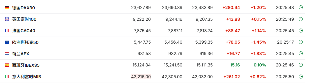 正在交易的欧洲股市整体走高,德国DAX指数现涨1.2%,英国富时100指数涨0.15%,法国CAC40指数涨1.14%。