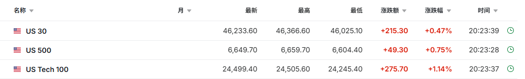 截至发稿,道琼斯指数期货涨0.47%,标普500指数期货涨0.75%,纳斯达克100指数期货涨1.14%。