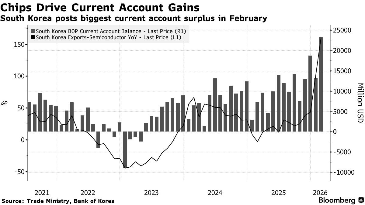 智通财经APP获悉,在中东战争开始对能源市场和全球航运产生连锁影响之前,围绕存储芯片的半导体出口强劲推动韩国2月份货物贸易顺差扩大,创下历史最大月度规模经常账户顺差。根据韩国央行周三公布的数据,韩国2月份经常账户顺差达到232亿美元,创下单月历史最高纪录。其中,仅货物账户就创下234亿美元顺差,同样创纪录——出口同比大增近30%,远高于进口4%的增幅。