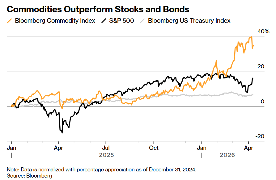 自2025年初以来,彭博大宗商品指数已大幅上涨35%,是同期标普500指数回报的足足两倍多。美国国债指数的基准涨幅甚至不足7%。尤其是原油,今年大幅飙升,因为伊朗在战争爆发后对大多数航运系统实质上关闭了霍尔木兹海峡;与此同时,从黄金、白银到铜等金属,原本就已受益于央行买入和AI算力基础设施持续繁荣局面等顺风因素。