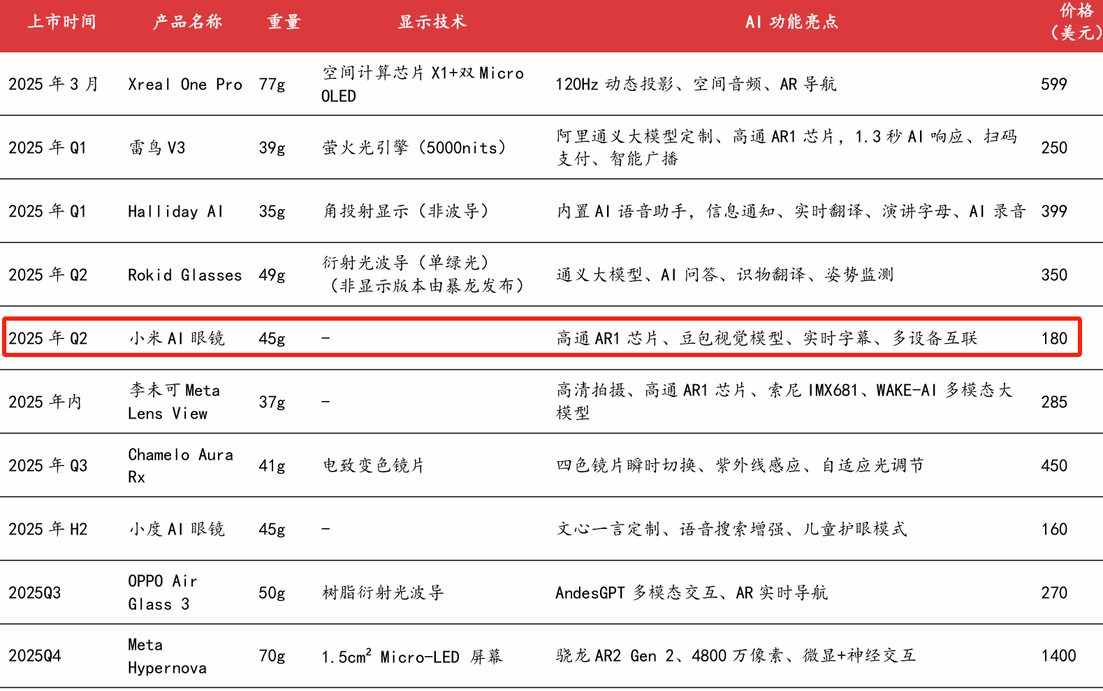 图:2025年规划上市AI(含AR)眼镜信息汇总(不完全梳理) |