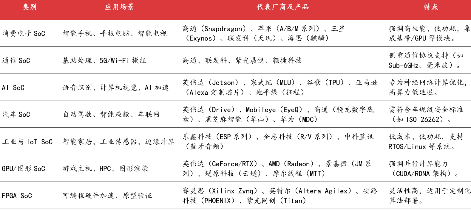 图:SoC芯片细分应用及国内外代表厂商 |