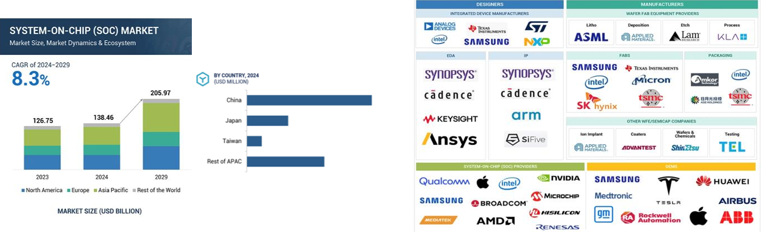 SoC芯片市场持续增长,亚洲市场份额最高。随着自动驾驶渗透率逐步提升,IoT和通讯设备的采用率激增,以及AI浪潮和机器学习的浪潮席卷,SoC芯片需求逐步提升。根据MarketsandMarkets,全球SoC市场规模预计2029年达约2060亿美金,2024-2029年CAGR约8.3%。其中亚洲和北美的市场份额领先,2023年亚洲市场规模占比37%,预计中国和印度等国家SoC市场规模将持续快速增长。