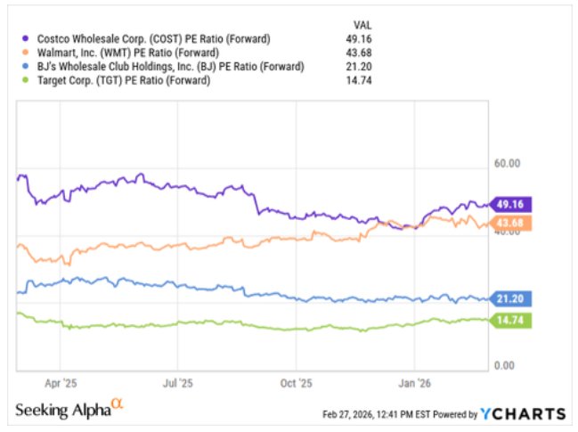 这一估值中包含了巨额的商誉溢价,因为声誉对消费者而言依然至关重要,尤其是在当前的经济环境下。同时,市场也预期好市多具备其他公司所没有的增长能力,能够持续渗透新市场;例如,BJ's 批发俱乐部(BJ.US)仅局限于美国国内市场,而好市多则有可观的海外收入。