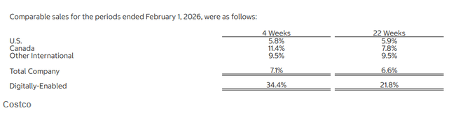好市多1月销售表现强劲,净销售额约210亿美元,同比增长9.3%;本财年前22周(接近半个财年)销售额同比增长8.5%。增长稳健,也符合市场对好市多的普遍预期。