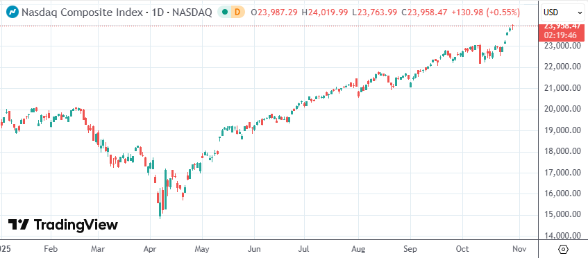 纳斯达克综合指数涨0.55%,报23958.47点,刷新了周二录得的收盘历史纪录,这也是该指数连续第四个交易日收于新高,盘中甚至一度涨破24000关口。