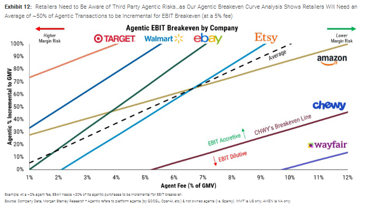 研报认为,当消费者通过第三方Agent(如OpenAI的ChatGPT)完成购物时,零售商不仅失去了直接触达客户的机会,还可能需要向Agent支付佣金,这对其利润表是双重打击。