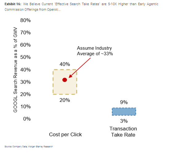 谷歌面临转型: 谷歌搜索正处在十字路口。报告估算,目前,谷歌搜索广告的“实际佣金率”(广告支出占商品交易总额GMV的百分比)平均约为33%,而OpenAI等提供的早期Agent交易佣金仅为个位数,两者相差5到10倍。如果谷歌不能主导Agent购物,其高利润模式将受到严重侵蚀。
