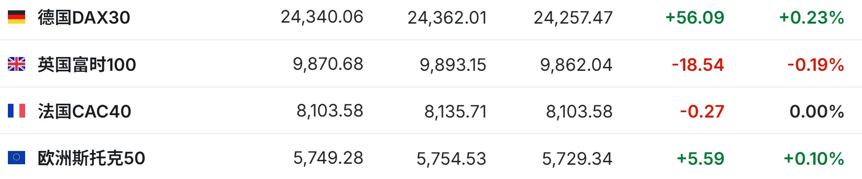 2. 截至发稿,德国DAX指数涨0.23%,英国富时100指数跌0.19%,法国CAC40指数微跌,欧洲斯托克50指数涨0.10%。