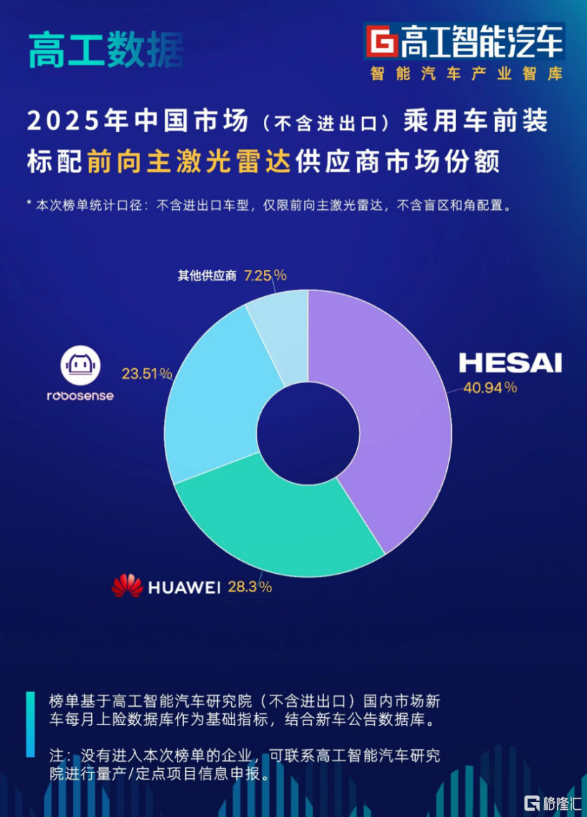 禾赛是这一浪潮的最大赢家,并形成断层式领先。高工数据显示,2025年禾赛在中国市场乘用车前装标配前向主激光雷达领域,以超40%的市场份额稳居行业第一。根据盖世数据,2025年中国乘用车市场主激光雷达总装机量为275.6万台,禾赛贡献114.3万台,是行业第二名的近1.5倍、第三名的近2倍。