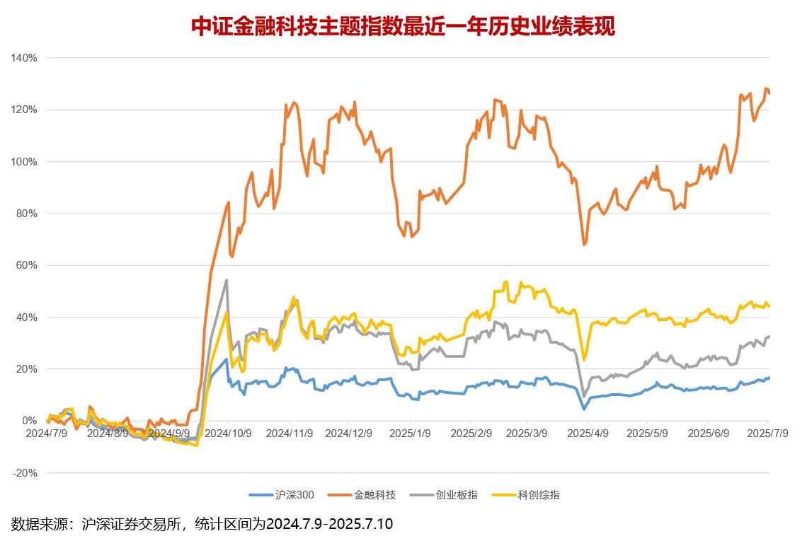 一般而言,能进行份额拆分的基金通常都是过往业绩表现较好的基金。正是优秀的历史业绩垒高了基金净值,为份额拆分提供了良好基础。截至2025年7月10日,受益于其互联网券商和金融信息服务商板块的强贝塔属性,A股规模最大金融科技ETF(159851)跟踪的标的指数——中证金融科技主题指数(930986)最近一年累计涨幅达126.25%,显著超越沪深300指数、创业板指、科创综指等主流宽基指数同期涨幅表现(具体见下图)。