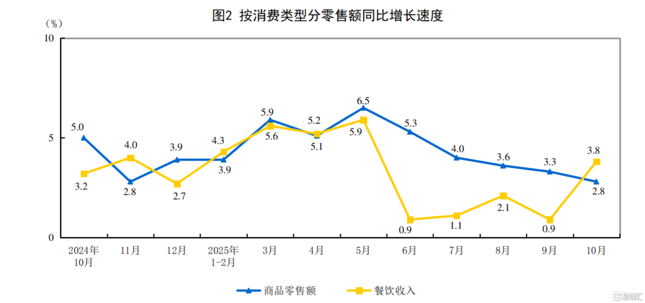 按消费类型分,10月份,商品零售额41092亿元,同比增长2.8%;餐饮收入5199亿元,增长3.8%。1—10月份,商品零售额365981亿元,增长4.4%;餐饮收入46188亿元,增长3.3%。
