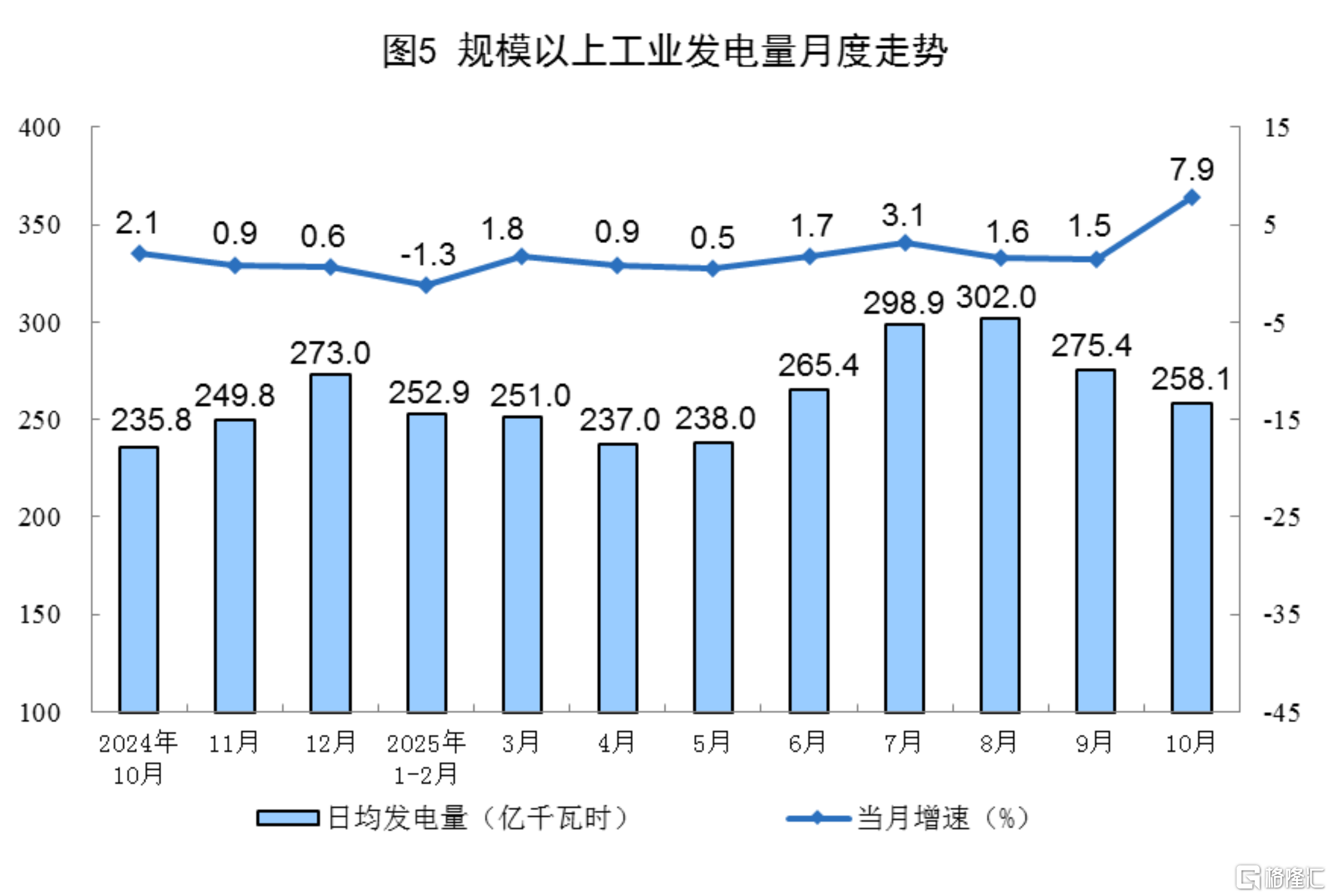 规上工业电力生产增速加快。10月份,规上工业发电量8002亿千瓦时,同比增长7.9%,增速比9月份加快6.4个百分点;日均发电258.1亿千瓦时。1—10月份,规上工业发电量80625亿千瓦时,同比增长2.3%。