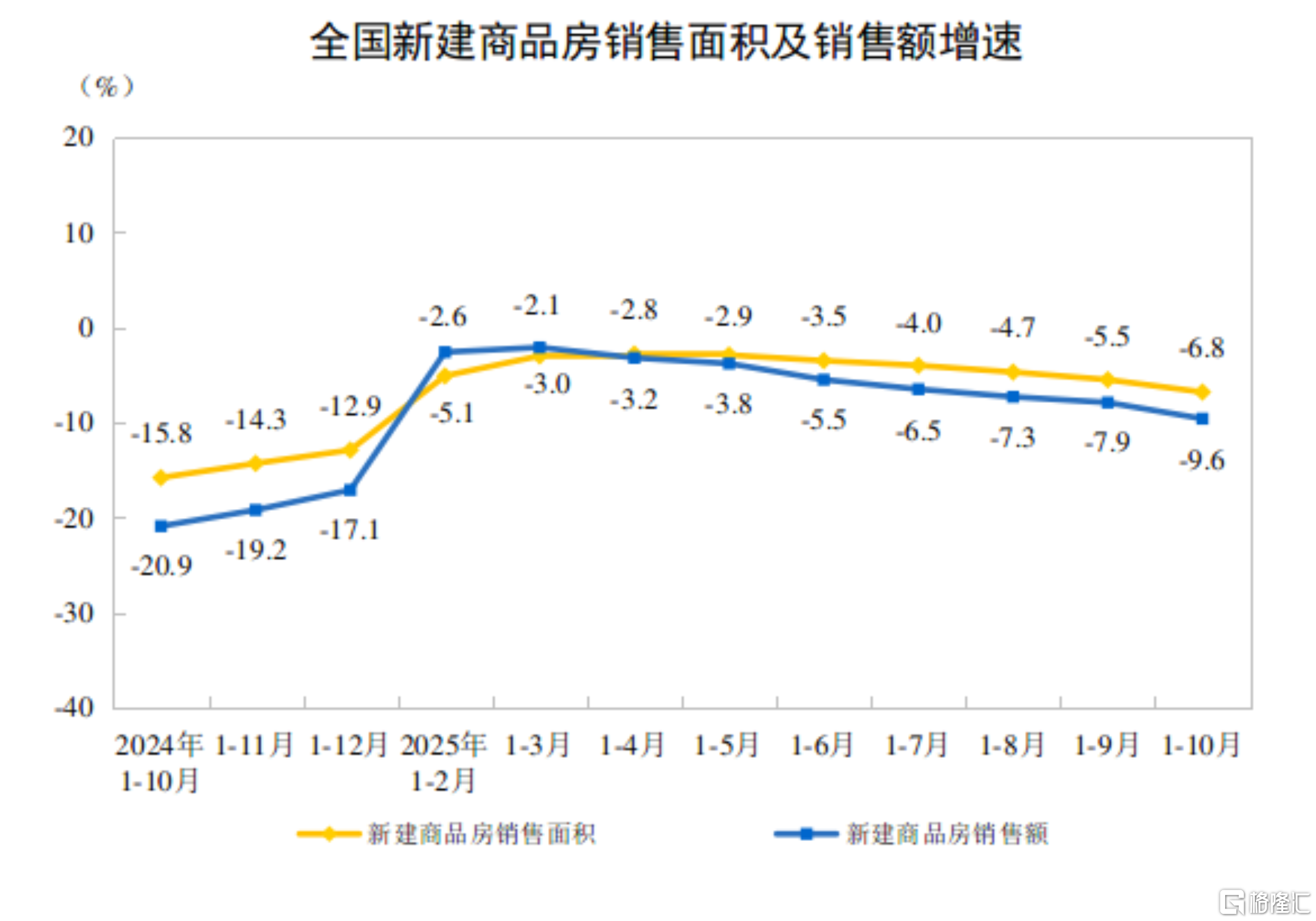 1—10月份,新建商品房销售面积71982万平方米,同比下降6.8%;其中住宅销售面积下降7.0%。新建商品房销售额69017亿元,下降9.6%;其中住宅销售额下降9.4%。