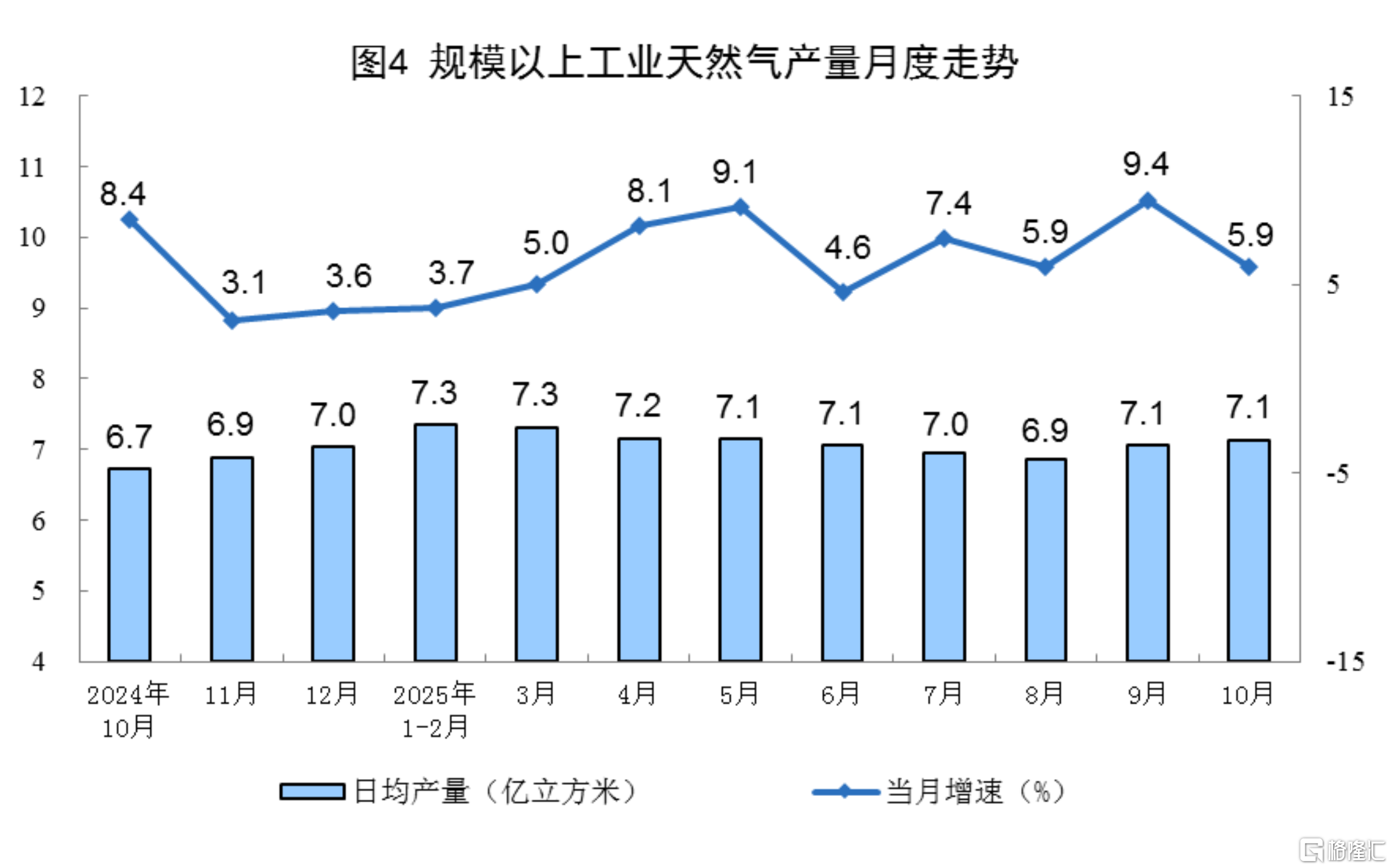 天然气生产增速放缓。10月份,规上工业天然气产量221亿立方米,同比增长5.9%,增速比9月份放缓3.5个百分点;日均产量7.1亿立方米。