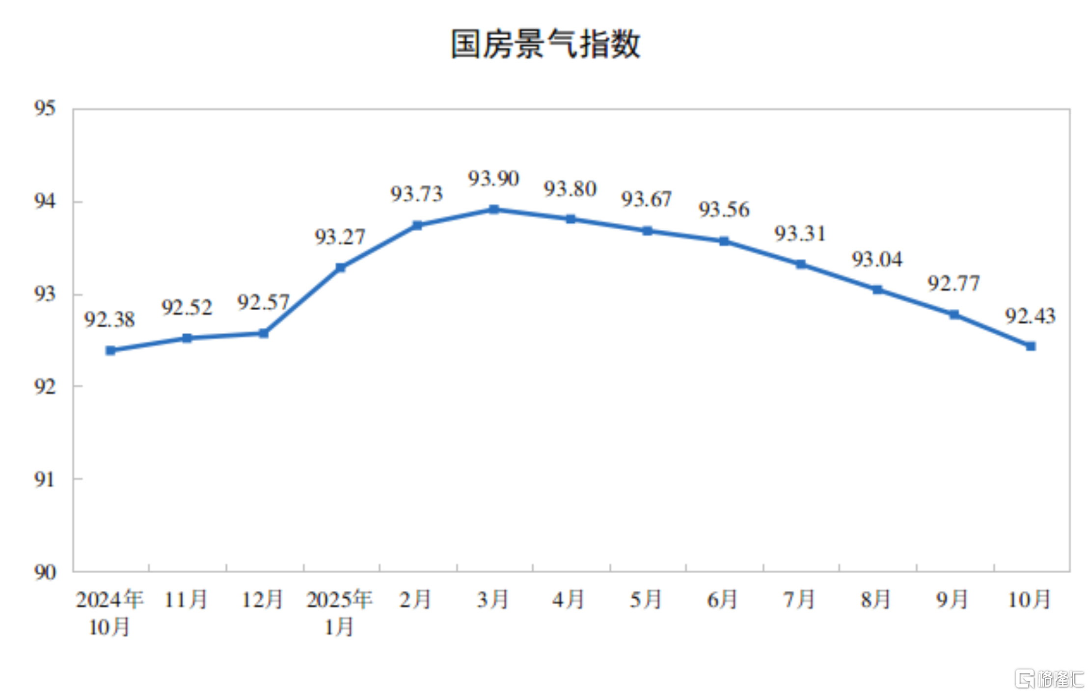 10月份,房地产开发景气指数(简称“国房景气指数”)为92.43。