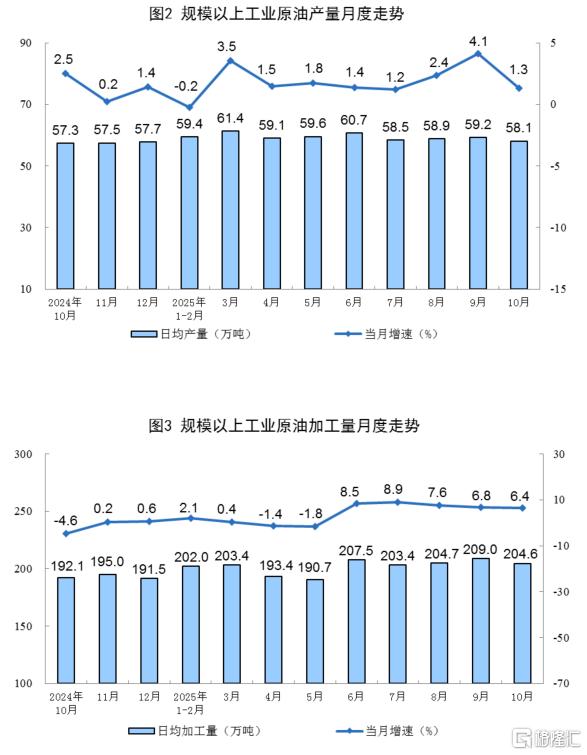 原油生产保持增长。10月份,规上工业原油产量1800万吨,同比增长1.3%,增速比9月份放缓2.8个百分点;日均产量58.1万吨。