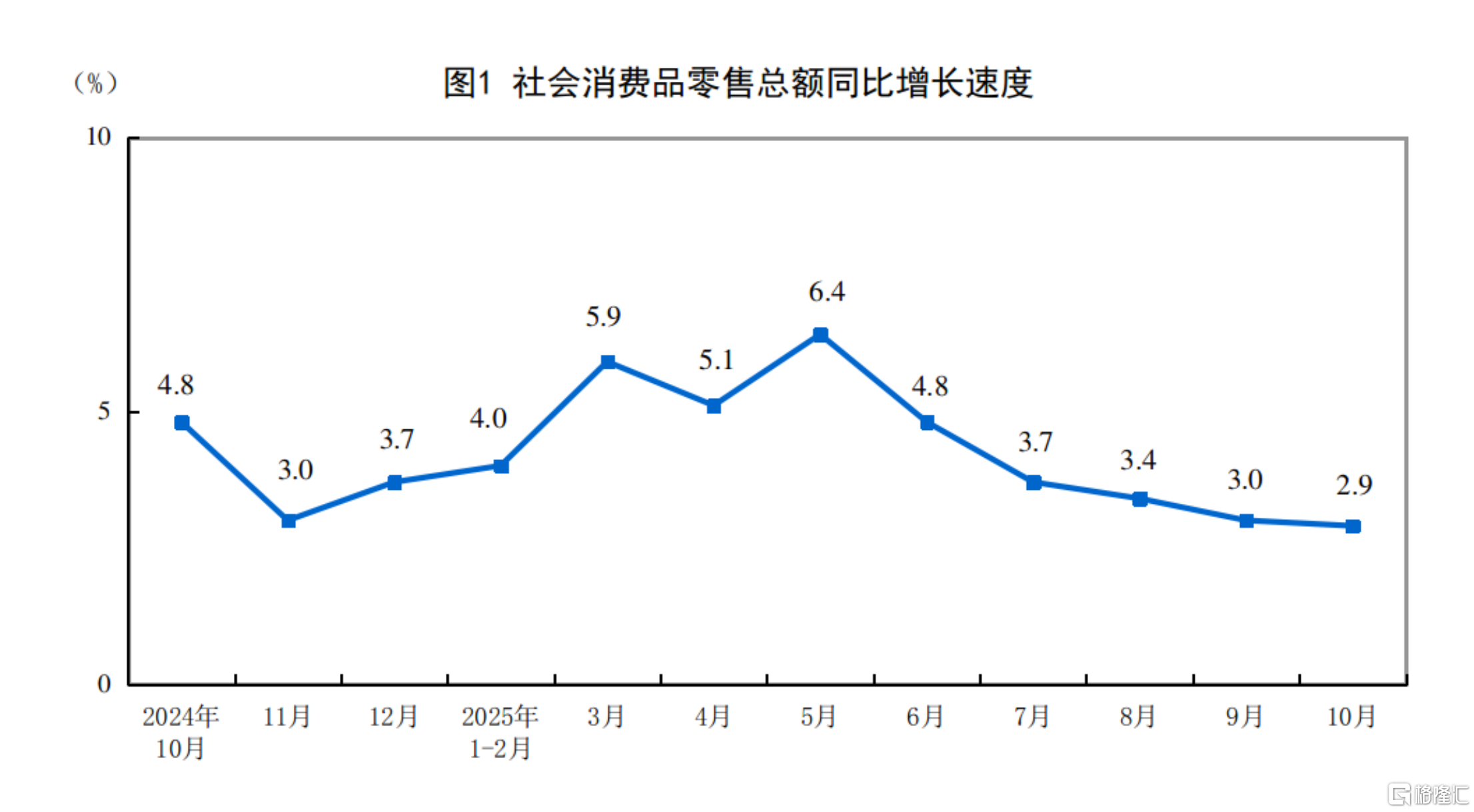 10月份,社会消费品零售总额46291亿元,同比增长2.9%。其中,除汽车以外的消费品零售额42036亿元,增长4.0%。1—10月份,社会消费品零售总额412169亿元,增长4.3%。其中,除汽车以外的消费品零售额372160亿元,增长4.9%。