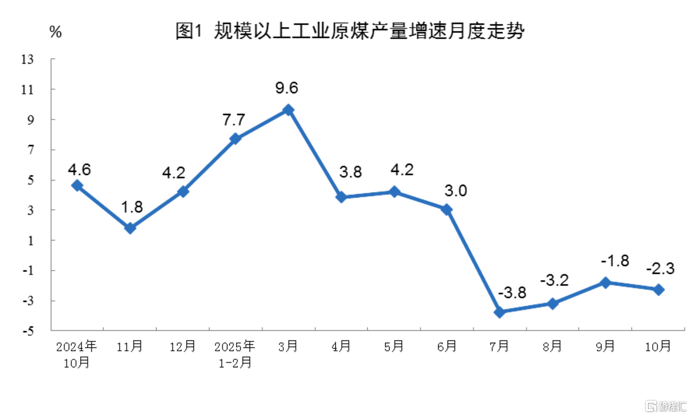 原煤生产保持较高水平。10月份,规上工业原煤产量4.1亿吨,同比下降2.3%;日均产量1312万吨。