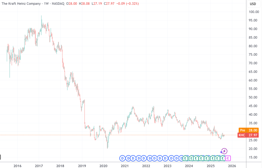 从股价表现不难看出,卡夫亨氏仅在合并后高光了两年。巴菲特等投资人很快就发现,随着消费者寻求更健康的食品选择,这家公司的许多品牌已经跟不上需求变化。2017年市值短暂突破千亿美元关口后,公司股价至今跌幅仍超过70%。
